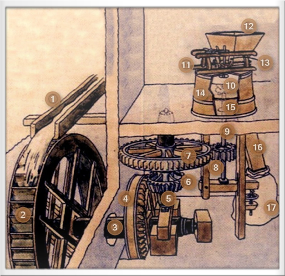 Das über ein Gerinne (1) von oben angetriebene (oberschlächtige) Wasserrad (2) dreht den waagerechten Wellbaum (3) und das große hölzerne Kammrad (4).